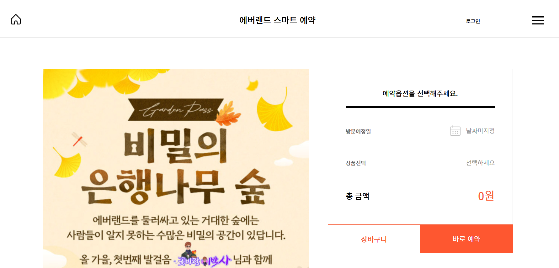 아래 링크를 통해 에버랜드 비밀의 은행나무 숲 예약 사이트로 이동이 가능합니다.